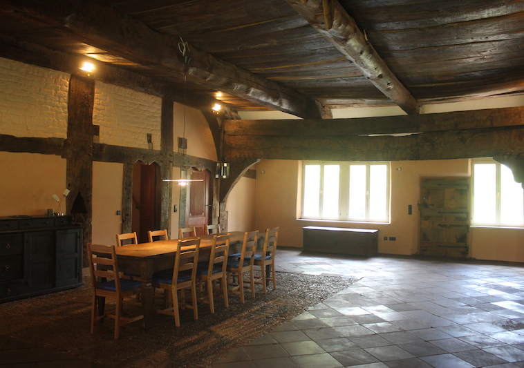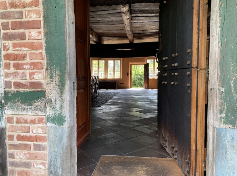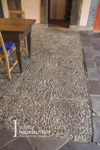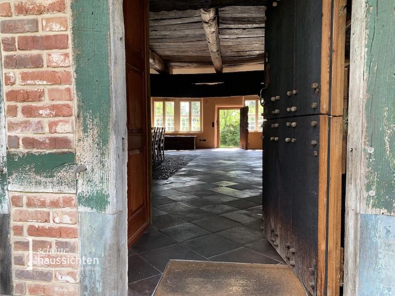 Das Haupthaus hat eine Grundfläche von 29 m x 12 m. Sie betreten den Wohnbereich an der Seite des Hauses und gelangen in den Hauptraum, das sogenannte Flett. Dieser Raum hat eine Größe von ca. 75 m² und ist als offener Raum mit Küchenbereich gestaltet. Hier hat der riesige Teakholztich für viele Gäste Platz aber auch die gemütliche Sitzecke nach Süden. Der Boden ist mit historischen Weser-Sandsteinfliesen belegt, im Bereich der früheren Feuerstelle und im gesamten Mittelteil des Fletts wurde das originale Weserkiesel-Mosaik aus dem Jahr 1797 erhalten.