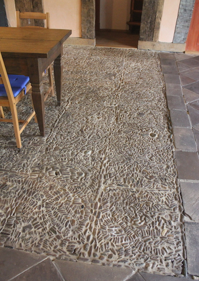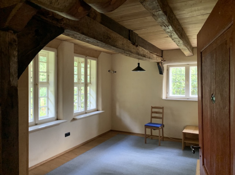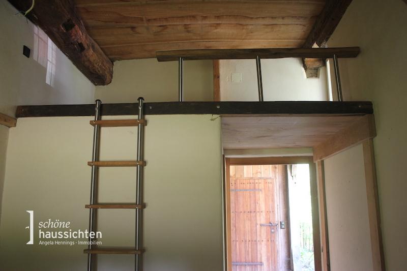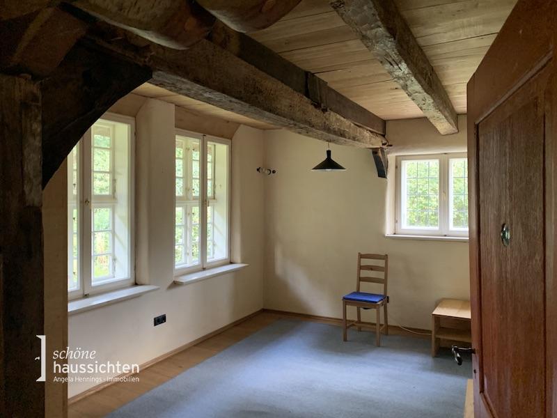 An der Stirnseite des Hauses befinden sich drei Stuben mit jeweils 15, 13 und 11 m² Wohnfläche. Über eine Holztreppe erreichen Sie im Obergeschoss einen weiteren Raum mit einer Größe von ca. 30 m² mit einem angeschlossenen Abstellraum. Die völlig baubiologisch aufgebauten Fußböden sind im Erdgeschoss mit Eichendielen belegt, im Obergeschoss sind die Dielen aus Lärchenholz.