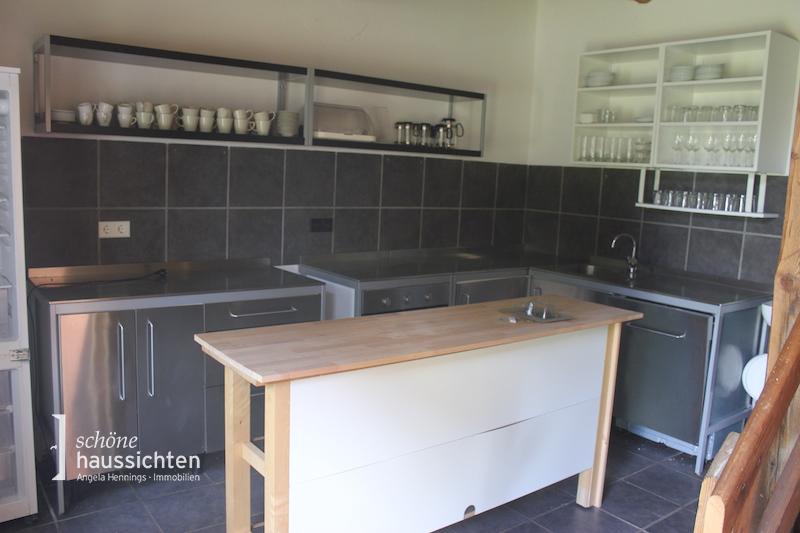 Das Nebengebäude hat eine Gesamtfläche von ca. 128 m². Ein Teil dieses Hauses wurde als Café genutzt und die Infrastruktur hierfür ist noch vorhanden. Ein sehr schöner, heller Gastraum mit vorgelagerter Terrasse sowie eine voll eingerichtete Küche steht Ihnen zur Verfügung. Eine Toilettenanlage getrennt nach Geschlechtern ebenfalls. Im vorderen Bereich gibt es eine Garage und einen Scheunenteil für die Gartengeräte. Das Obergeschoss mit einer Fläche von ca. 96 m² wäre ebenfalls noch ausbaubar.