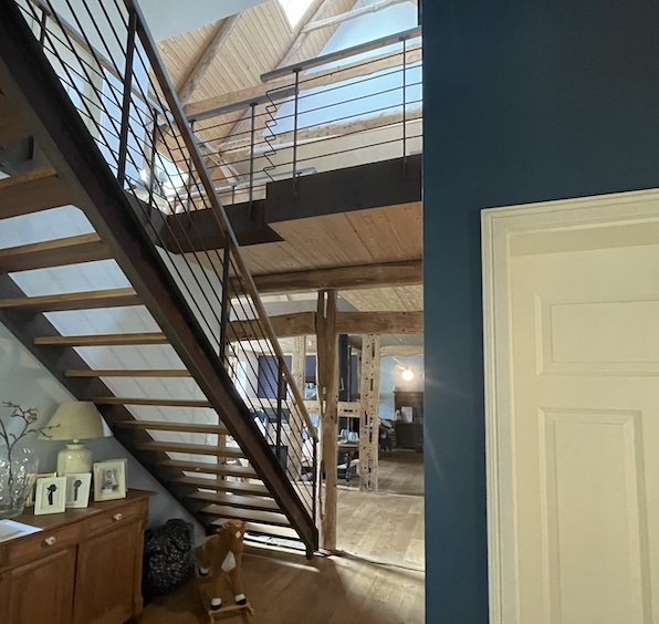 Über eine elegante Stahltreppe mit Eichenstufen gelangen Sie in das Obergeschoss des Hauses. Hier befinden sich die beiden Kinderzimmer mit jeweils einem zuätzlichen Raum, wahlweise als Büro oder Ankleidezimmer genutzt. Ein separates Duschbad für die Kinder befindet sich zwischen den Zimmern. Das Elternschlafzimmer erreichen Sie über eine offene Galerie, es befindet sich auf der rechten Haushälfte. Hier wurde die Voraussetzung für eine weiteres Badezimmer geschaffen, eine freistehende Badewanne ist bereits installiert.