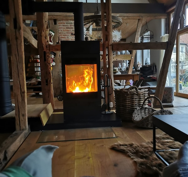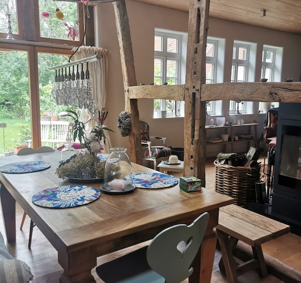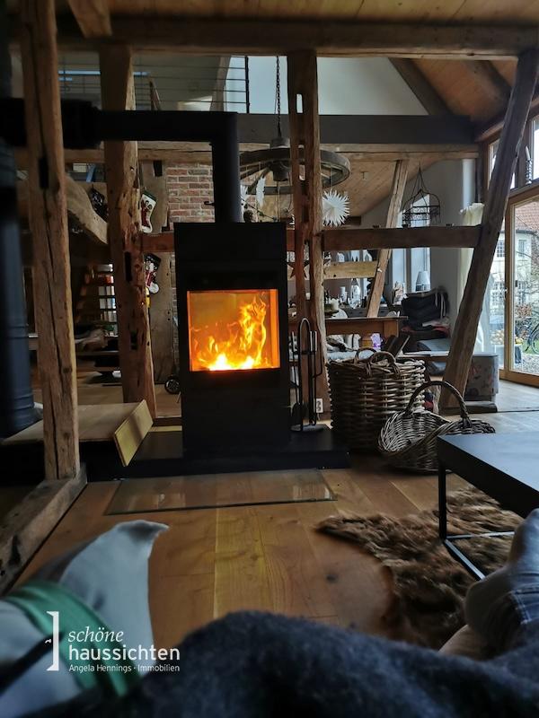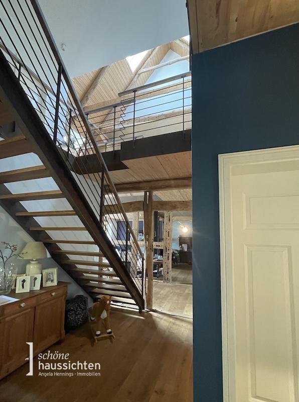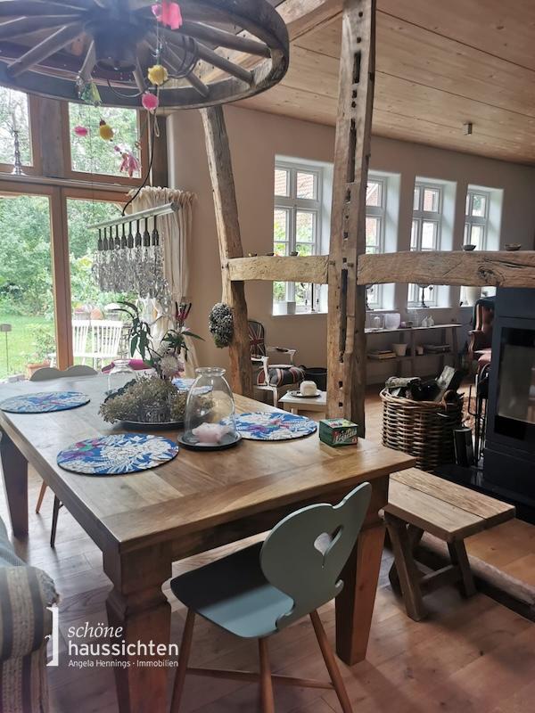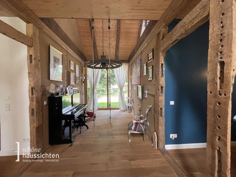 Das wunderschöne Fachwerk-Haupthaus betreten Sie über einen Windfang an der linken Giebelseite. Es schließt sich ein geräumiger Flur mit tollen Blickachsen bis zum First an. Das Herzstück des Hauses ist ein großer Wohn- Essbereich mit zentralem Holzofen. Von hier haben Sie Zugang zur Terrasse und zum parkähnlichen Grundstück mit altem Baumbestand. Die Eichendielen und sichtbaren Ständer geben dem Raum zusätzlich einen warmen Charakter.