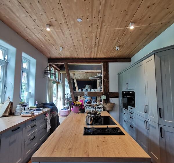 Die ca. 27 m² große Küche ist mit einer grau-blauen Schüller-Einbauküche mit zentraler Kochinsel ausgestattet. Sie lässt keine Wünsche offen, ob Sie lieber mit Gas oder Strom kochen, beides ist möglich! Ein Abstellraum bietet Platz für Ihre Vorräte.