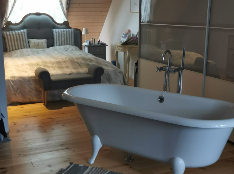 Über eine elegante Stahltreppe mit Eichenstufen gelangen Sie in das Obergeschoss des Hauses. Hier befinden sich die beiden Kinderzimmer mit jeweils einem zuätzlichen Raum, wahlweise als Büro oder Ankleidezimmer genutzt. Ein separates Duschbad für die Kinder befindet sich zwischen den Zimmern. Das Elternschlafzimmer erreichen Sie über eine offene Galerie, es befindet sich auf der rechten Haushälfte. Hier wurde die Voraussetzung für eine weiteres Badezimmer geschaffen, eine freistehende Badewanne ist bereits installiert.
