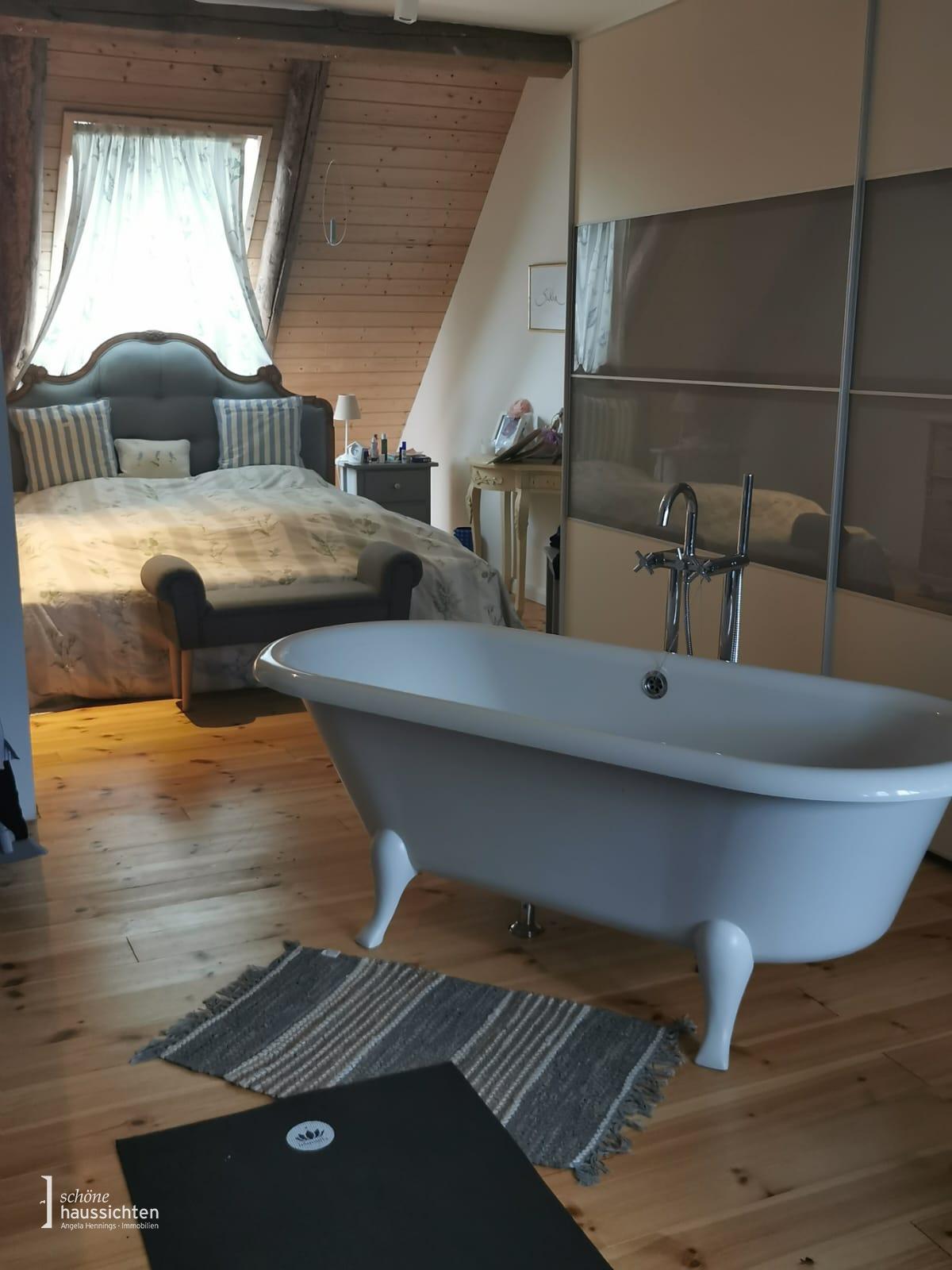 Über einen Windfang betreten Sie das wunderschöne Fachwerkhaus an der linken Giebelseite. Es schließt sich ein geräumiger Flur mit tollen Blickachsen bis zum First an. Das Herzstück des Hauses ist ein großer Wohn- Essbereich mit zentralem Holzofen. Von hier haben Sie Zugang zur Terrasse und zum parkähnlichen Grundstück mit altem Baumbestand. Die Eichendielen und sichtbaren Ständer geben dem Raum zusätzlich einen warmen Charakter.